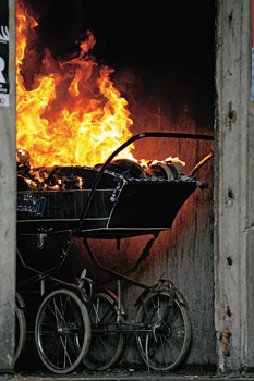 Die Kunststoffaufsätze von Kinderwagen sind leicht entzündlich – das birgt Gefahr im Treppenhaus