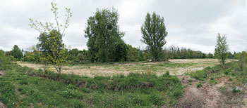 Wo heute noch eine grüne Brache ist (unten), wird demnächst diese Idee einer kleinen genossenschaftlichen Öko-Siedlung (oben) realisiert werden