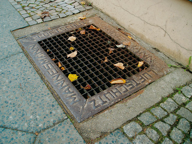 Etwas häufiger findet man noch drei kurze senkrechte Streifen: Sie bezeichnen Wasserentnahmestellen. Das sind in der Regel Gullyeinläufe. Für den Fall, dass das Wasserleitungsnetz beschädigt worden war und deshalb kein Wasserdruck auf den Hydranten lag, konnte man so wenigstens versuchen, aus dem Abwasserkanal Löschwasser anzusaugen.