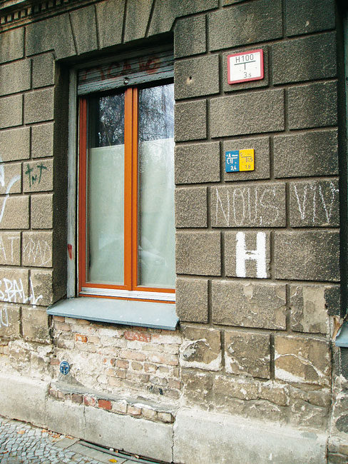Neben den Luftschutzpfeilen lassen sich an Fassaden weitere Zeichen entdecken. Ein weißes H ist ein Hinweis auf einen Hydranten, der sich an dieser Stelle vor dem Gebäude befindet. Löschkräfte konnten so im Dunkeln schnell die Stellen zum Anschluss der Schläuche finden.