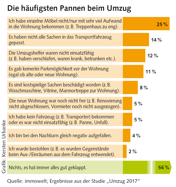 Ein Ranking der häufigsten Umzugspannen hat das Internetportal „Umzugsauktion.de“ erstellt. Ein häufiges Ärgernis ist demnach der zu kleine Transporter. Das ist besonders fatal, wenn der Umzug in eine neue Stadt führt und einige Möbel einfach nicht mehr in den Wagen passen. 14 Prozent der Deutschen standen bereits vor diesem Problem. Weitere 12 Prozent warteten vergeblich auf ihre Umzugshelfer, die hatten entweder verschlafen oder waren erkrankt. Mit fehlenden Parkmöglichkeiten vor der neuen oder der alten Wohnung mussten sich 11 Prozent herumschlagen.