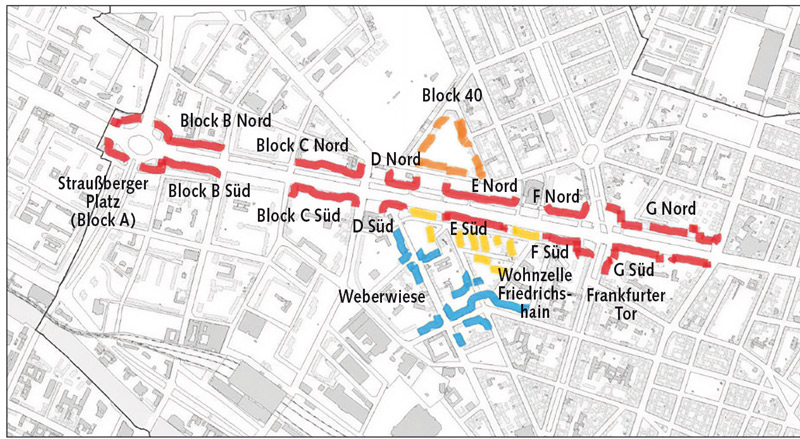 rot: die eigentliche „Stalinallee“ mit ihren Blöcken A bis G
