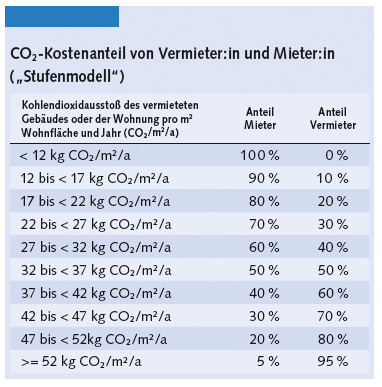 wird. Dieser lag 2023 bei 30 Euro pro Tonne und ist 2024 auf 35 Euro gestiegen. Im Jahr 2026 liegt er in einem Korridor von etwa 55 bis 65 Euro pro Tonne, da ab diesem Zeitpunkt ein Preisspielraum mit Mindest- und Höchstgrenze vorgesehen ist, innerhalb dessen sich der Preis am Markt bilden kann. Auf dieser Grundlage werden die Gesamtkosten für das Gebäude berechnet und entsprechend der Stufe des energetischen Gebäudezustands zwischen Mieter:innen und Vermieter:innen aufgeteilt (hierzu unsere Tabelle). Die Verteilung auf die einzelnen Wohnungen erfolgt wie gewohnt nach den Regeln der Heizkostenverordnung.