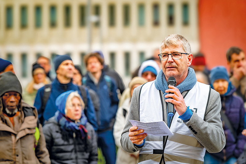 „Die Verwaltung muss endlich tätig werden“, forderte BMV-Geschäftsführer Sebastian Bartels in seiner Rede vor dem Demonstrations-Publikum. Dass das Bezirksamt Ende 2025 die Abrissgenehmigung verlängert hat, sei ein Skandal. 120 bezahlbare Mietwohnungen mitten in der Stadt stünden auf dem Spiel. „Wenn diese Wohnungen erhalten bleiben, sendet das ein Signal an andere Eigentümer:innen mit vergleichbaren verbrecherischen Entmietungsmethoden“, sagte Annegret Taube vom Bündnis „Leerstand Hab Ich Saath“. Sie sprach auch über die hohe emotionale Belastung, die dieser existenzielle Kampf um den eigenen Wohnraum für die Bewohner:innen bedeutet. Die verbliebenen Mieter:innen würden in einem permanenten Ausnahmezustand leben.