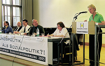 Wasserknappheit herrschte bei wärmsten Außentemperaturen gleich zu Beginn, als die 150 Delegierten des BMV sich im Rathaus Charlottenburg zur alljährlichen Delegiertenversammlung zusammenfanden. Hitzig wurde die Debatte mit der eingeladenen Hauptreferentin des Abends, Sozialsenatorin Knake-Werner (PDS), jedoch nur an wenigen Stellen, als sich die Anwesenden mit Hartz IV und den Folgen befassten. „Wohnungspolitik als Sozialpolitik“ stand im Programm und die Referentin teilte die Beobachtung des Vorsitzenden Edwin Massalsky, dass „die gemeinsame Schnittmenge von Sozial- und Stadtentwicklungsverwaltung in den letzten Jahren zugenommen hat“.