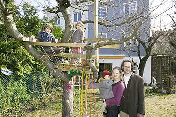 Gesine und Stefan Harries hätten ihre schöne Eigentumswohnung in Charlottenburg nie verlassen, wären da nicht Lewin, Neele und Bela. Für den heute sechsjährigen Lewin, die vierjährige Neele und den ein Jahr alten Bela tauschten die Eltern ihre 95-Quadratmeter-Jugendstilaltbauwohnung gegen ein 120-Quadratmeter-Haus im Tempelhofer Leonhardyweg. „Ich würde nicht hier wohnen, wenn ich keine Kinder hätte. Aber als Lewin ein Jahr alt und ich mit Neele schwanger war, wollten mein Mann und ich unbedingt einen Garten für die Kleinen“, sagt Gesine Harries. Also suchten die beiden ein Haus mit Grünfläche. Anfangs überlegten sie zu kaufen, doch kein Haus war so überzeugend, dass die jungen Leute ihr gesamtes Eigenkapital investiert hätten. „Außerdem wollten wir uns nicht so fest binden. Mein Mann ist selbstständig und hat ein Büro für Meerestechnik. Heutzutage muss man flexibel sein“, so die 36-jährige Dozentin für Kunstgeschichte. Nun wohnt die Familie seit fünf Jahren im ehemaligen Fliegerviertel nahe des Flughafens Tempelhof in einer Doppelhaushälfte. Das Haus entstand in den 20er Jahren des vergangenen Jahrhunderts. Im Keller wurde ein ehemaliger Stall zum Heizraum umfunktioniert, die fünf Zimmer, Küche und Bad sind teils nicht sehr groß. Aber das Haus hat Charme und es hat einen etwa 250 Quadratmeter großen Garten. „Der wird wirklich exzessiv genutzt. Sobald das Wetter einigermaßen erträglich ist, spielen die Kinder dort ausgiebig“, sagt Gesine Harries. Schließlich gibt es ein Baumhaus, ein extra Spielehaus mit Übernachtungsmöglichkeit und einen Sandkasten direkt neben dem Erdbeerbeet – ein Familienidyll für 956 Euro Kaltmiete plus 300 Euro Nebenkosten monatlich.