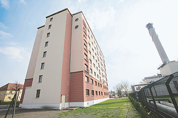 Als Heinz Bischoff der Stadtplanung seinen Bauantrag vorlegte, stieß er auf durchweg positive Resonanz. Die geplante Nutzungsänderung der Gewerbeplatte wurde wohlwollend aufgenommen. „Die Wohnruhe ist hier gesichert, denn die Gewerbenutzung ringsum geht gegen Null“, erklärt Ute Löbl, Leiterin des Stadtplanungsamts Köpenick. Jahrelang war der Anblick des heruntergekommenen Betonklotzes für die Anwohner ein Ärgernis. „Das Gebiet musste mit einem als Bürohaus errichteten Fremdkörper leben. Heute würden wir einen Bau von dieser Höhe und Kubatur hier nicht mehr in die Landschaft stellen“. Abreißen konnte man das bestandsgeschützte Haus allerdings nicht, daher sei man froh gewesen, als sich ein Investor für den grauen Achtgeschosser fand. Heute harmonisiert immerhin die Fassade des Gebäudes mit den Reihenhäusern und den viergeschossigen Mietshäusern in der Nachbarschaft.