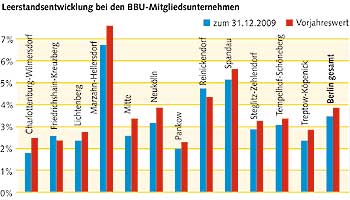 Bei den Wohnungsunternehmen, die dem Verband Berlin-Brandenburgischer Wohnungsunternehmen (BBU) angehören, standen zum Jahresende 2009 in Berlin gut 23.000 Wohnungen leer. Mit einem Rückgang der Leerstände um 0,4 auf 3,5 Prozent setzt sich der Trend der Vorjahre fort.