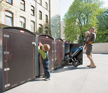 Als Madeleine und Volker M. im Oktober 2011 in eine größere Wohnung in der Kreuzberger Oranienstraße zogen, weil sich ihre Familie um den kleinen Emilian erweitert hatte, bot ihnen ihr Vermieter eine Box an, die ihnen das Tragen des Kinderwagens in den vierten Stock oder in den Keller erspart und eine sichere Unterbringung garantiert. Der Service ist dem Ehepaar die 10 Euro Miete im Monat wert. Auch Kindersitz, Spielzeug und Laufrad finden inzwischen hier Platz. Die verschließbare Box steht auf dem Hof, direkt neben dem Hausdurchgang. Ihr Vermieter hat im vergangenen Jahr eine größere Anzahl der Behältnisse gekauft – im Dutzend sind sie schließlich billiger. Auch ältere Mieter nutzen sie gern, zum Beispiel, um ihren Rollator oder Rollstuhl sicher zu „parken“.