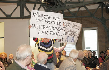Die politische Offenheit des Senators hatte aber ein Ende, als es um die zahlreich vorgetragenen Forderungen nach Begrenzung der Wiedervermietungsmieten ging. Müller blieb bei den bekannten Elementen der Berliner Mietrechtsinitiative und gab zu bedenken, dass sich die Unterstützung selbst dafür „bei potenziellen Bündnispartnern, etwa in Hamburg, in Grenzen hält“. Reiner Wild, der Geschäftsführer des Berliner Mietervereins, konterte die bekundete Verzagtheit mit dem Hinweis, dass man in dieser Angelegenheit doch schon sehr viel weiter sei, als Müller dargestellt habe. In Hamburg und selbst in der Bundestagsfraktion gebe es bei der SPD Verbündete, die sich für eine Initiative inklusive Begrenzung der Wiedervertragsmieten stark machen würden. Ein Redner wies auf die zu diesem Thema kürzlich geführte Debatte im Nachbarland Frankreich hin.