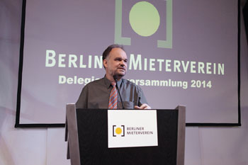 Die Bilanz des BMV-Geschäftsführers Reiner Wild zum Geschäftsjahr fiel positiv und mahnend zugleich aus. Mit 10.000 Neumitgliedern, 73.000 persönlichen und telefonischen Beratungen sowie 15.000 Beratungsfällen in der Geschäftsstelle habe man eine vorzeigbare Leistungsbilanz. Die Beratungsschwerpunkte spiegelten die Wohnungsmarktrealität wider, da es jetzt vorrangig um Miethöhe, Modernisierung und Umwandlung gehe. Die Internetseite, die derzeit überarbeitet werde, wurde 2013 von 2,2 Millionen Besuchern genutzt. Wild hielt sich neben seinen Positivmeldungen jedoch nicht mit selbstkritischen Anmerkungen zur Organisationsentwicklung zurück. Es mache ihm Sorgen, dass das Mitgliederwachstum ganz überwiegend nur von fünf Bezirken getragen werde. Auch wenn dahinter die Problematik sehr unterschiedlicher Teilwohnungsmärkte liege, müsse man in den restlichen Bezirken an einer deutlich verbesserten Präsenz und Beratung arbeiten.