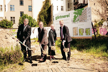 Stadtentwicklungssenator Müller (2.v.l.) beim ersten Spatenstich zum WBM-Neubauprojekt in der Gärtnerstraße: Die Mieten liegen zwischen 7,50 und 12 Euro