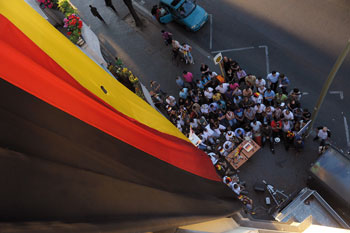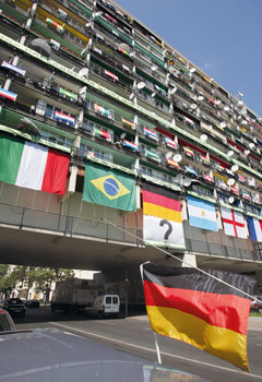 Die haushohe Deutschland-Fahne des Deutsch-Libanesen Bassal geriet im WM-Jahr 2010 ins Visier der Linksautonomen (rechts), WM-Beflaggung an einer Schöneberger Wohnanlage (unten)