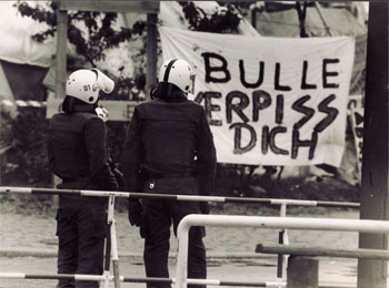 Legendär ist etwa der „Lappenkrieg“, der 1982 anlässlich des Reagan-Besuchs in Berlin ausbrach. Wir erinnern uns: Es war die Hoch-Zeit der Hausbesetzerbewegung, und der amerikanische Präsident war alles andere als beliebt in der linken Szene. Schon Wochen vor dem Besuch wurde auf dem Türkenmarkt billiger Stoff gekauft, mit Parolen wie „Reagan how up“ oder „Der reagt mir uff“ besprüht und an 15 besetzten Häusern in Kreuzberg aufgehängt. Die Polizei bildete daraufhin eine Sonderkommission und schritt, bewaffnet mit Leitern, Enterhaken und Farbeimern, zur Entfernung der Lappen beziehungsweise Übertünchung der Sprüche an den Hausmauern. Die amerikafeindlichen Parolen waren zum Teil direkt auf die Fassaden gesprüht, wie die „Häuserkampf-Chronologie“ von 1982 zu berichten weiß: „Hier trat eine Malerkolonne der Polizei in Aktion, verhedderte sich dabei allerdings in dem teilweise unübersichtlichen Angebot der Wandparolen.“ Das Katz-und-Maus-Spiel zog sich über mehrere Tage hin. Kaum war die Polizei weg, wurden die „Bullenmalwände“, wie sie schon bald genannt wurden, wieder neu besprüht. Es kam zu Festnahmen und Beschlagnahmungen der Transparente, denn die Polizei wertete Sprüche wie „Reagan und Spezialisten – Mörder und Faschisten“ als Beleidigung fremder Staatspersonen, ein Delikt, das auch ohne Strafantrag verfolgt werden kann. Ein Polizeisprecher, so schreibt die Häuserkampf-Chronologie, wollte die Parolen im Einzelnen gar nicht wiedergeben. „Da begebe ich mich ja selbst in den Bereich des Paragraphen 103, Absatz 1“, fürchtete er.