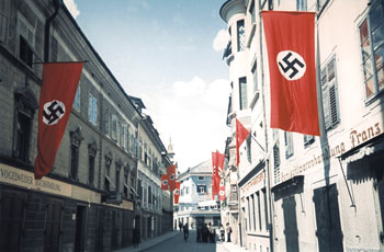 Die Nazis betrieben einen regelrechten Kult um die Fahne. Die Hakenkreuzfahne war das zentrale Symbol des Nationalsozialismus. Sie wurde mit Liedern und Gedichten verehrt und sogar geweiht – ein Ritual, das einiges aussagt über die mystisch verbrämte Ideologie. Auch im Alltag spielte der Fahnenkult eine große Rolle. Bei der Hitlerjugend war sie bei jedem Anlass dabei, und bei Aufmärschen und Paraden waren viele Häuser beflaggt. Ziel war es, das Zusammengehörigkeitsgefühl zu stärken und eine gemeinsame Identität zu stiften.
