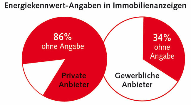 Nach einer Stichprobe der Mietervereine in Berlin, München, Hannover und Stuttgart haben 75 Prozent der Anbieter bei Wohnungsbesichtigungen den Testpersonen den Energieausweis nicht wie gesetzlich vorgeschrieben unaufgefordert vorgelegt. Selbst auf Nachfrage machten 50 Prozent der Vermieter beziehungsweise Makler keinerlei Angaben zur Energieeffizienz ihrer Objekte. Die Deutsche Umwelthilfe (DUH) bestätigt dieses katastrophale Ergebnis. Lediglich 14 Prozent der Immobilienanzeigen privater Vermieter und Verkäufer enthalten die gesetzlich vorgeschriebenen Informationen.