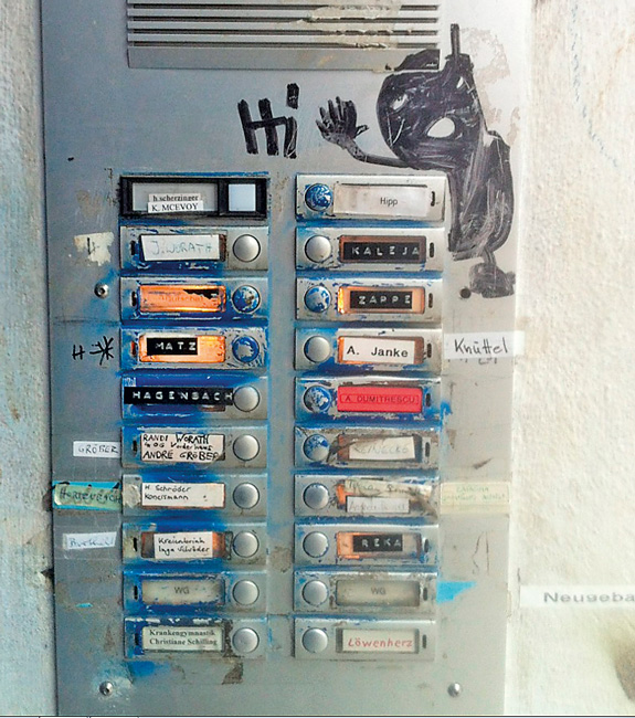 Ein wahres Panoptikum offenbart sich dem staunenden Betrachter: Neben den vereinzelten Fällen von wohlgeordneter Auflistung der Bewohner stechen vor allem die vielen unübersichtlichen Bretter mit den mehrfach überklebten Namensschildern, die oft noch auf den Platz daneben ausweichen, ins Auge. Viele Namen auf ein kleines Schriftfeld gequetscht zeigen: Man rückt wohl in den Wohnungen zusammen. Keine Hausverwaltung vereinheitlicht das äußere Erscheinungsbild, jeder neu Eingezogene nimmt irgendein Stück Papier, schreibt seinen Namen handschriftlich darauf und klebt ihn einfach dazu. Auch die Globalisierung lässt sich ablesen: Manche Häuser beherbergen dem Namen nach Bewohner aus aller Welt. Genauso auffällig ist gleichzeitig die Verwahrlosung der ursprünglich soliden metallenen Klingeltableaus: Mutwillig verdreckt, zerkratzt, beschmiert und angekokelt präsentiert sich hier der erste Eindruck des Hauses. Manchmal wird mit Aufklebern, Sprüchen und Tags der „letzte persönliche Schliff“ verpasst. Rein ästhetisch betrachtet ist das eine interessante Form von Street Art. Aber als Paketbote, der sich mühsam orientieren und Schriften entziffern muss, möchte man hier nicht arbeiten.