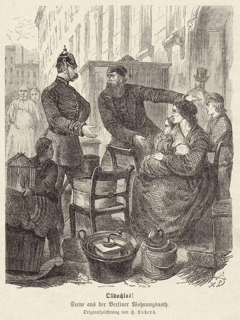 „Der beste Beweis dafür, was die Arbeiter vom preußischen Staat zu erwarten haben, liegt in der Verwendung der französischen Milliarden“, schrieb der sozialistische Vordenker Friedrich Engels 1872 in seiner Artikelserie „Zur Wohnungsfrage“. „Ist auch nur ein Taler dieser Milliarden verwandt worden, um die auf die Straße geworfenen Berliner Arbeiterfamilien unter Dach zu bringen? Im Gegenteil. Als der Herbst herangekommen, ließ der Staat selbst die paar elenden Baracken einreißen, die ihnen im Sommer als Notdach gedient hatten.“ Engels war sicher, „daß schon jetzt in den großen Städten hinreichend Wohngebäude vorhanden sind, um bei rationeller Benutzung derselben jeder wirklichen ‚Wohnungsnot‘ sofort abzuhelfen. Dies kann natürlich nur durch Expropriation [Enteignung] der heutigen Besitzer, resp. durch Bequartierung ihrer Häuser mit obdachlosen oder in ihren bisherigen Wohnungen übermäßig zusammengedrängten Arbeitern geschehen.“