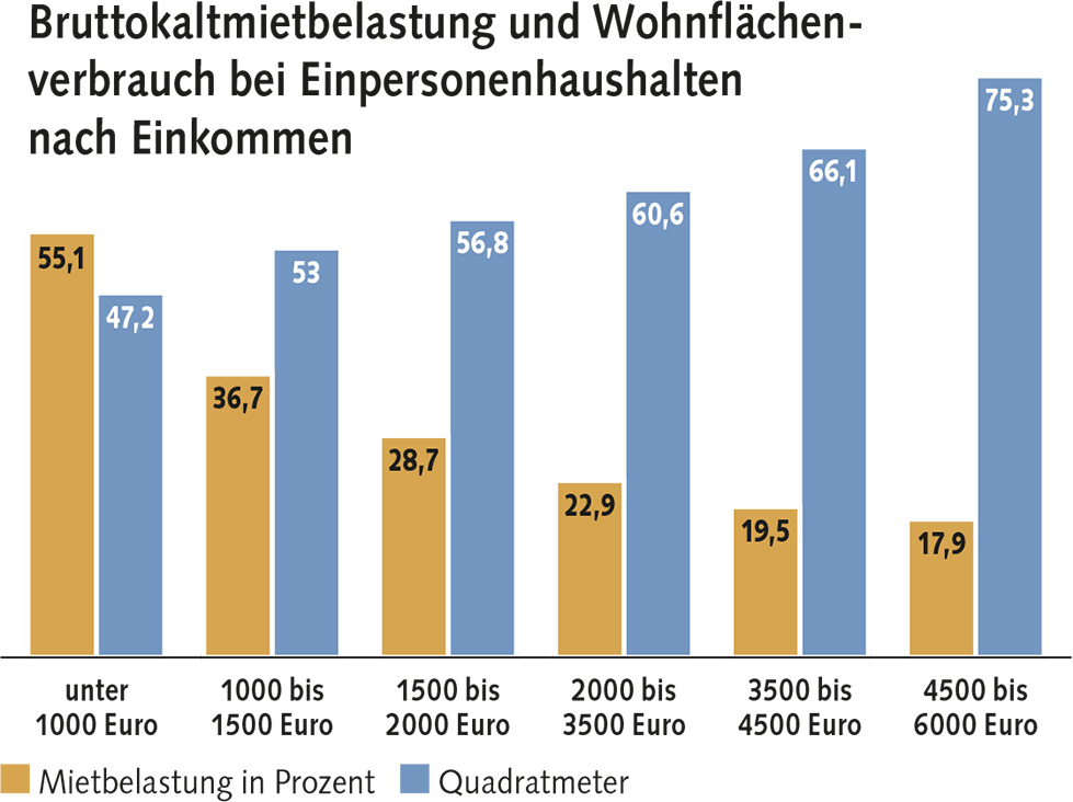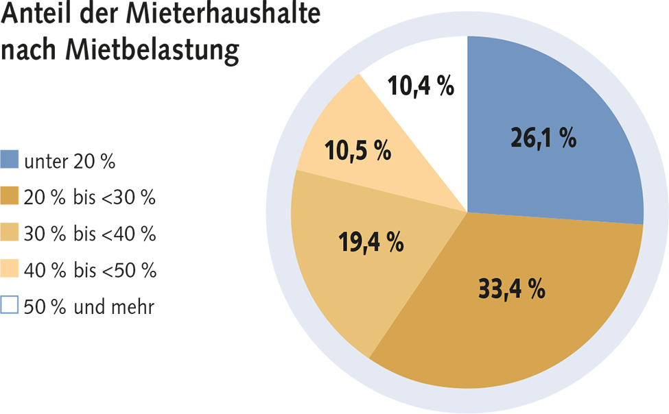 Die Mietbelastung nimmt teilweise beängstigende Ausmaße an. Ein Fünftel der Haushalte zahlt mehr als 40 Prozent des verfügbaren Einkommens für die Miete, ein weiteres Fünftel hat eine Mietbelastung zwischen 30 und 40 Prozent. Landläufig gilt eine Bruttokaltmietbelastung von 30 Prozent noch als unproblematisch. Härtefallregeln greifen meist erst ab dieser Schwelle. Dabei wird aber oft nur die Nettokaltmiete berücksichtigt. Rechnet man die Nebenkosten mit ein, ist eine Belastung von 40 Prozent schnell erreicht.