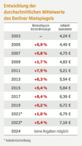 Nicht zuletzt haben auch das nach dem kurzlebigen Berliner Mietendeckel für die landeseigenen Wohnungsbaugesellschaften geltende Mieterhöhungsmoratorium und der sogenannte Mietendimmer die allgemeine Mietentwicklung erfolgreich gebremst. „Um diesen Einfluss im Mietspiegel zu verstetigen, ist es wichtig, dass die landeseigenen Wohnungsunternehmen weiterhin mäßigend handeln und Mieterhöhungsspielräume reguliert bleiben“, sagt BMV-Geschäftsführerin Wibke Werner. Das mittlerweile vom Senat beschlossene Aufweichen der Regulierungen gehe in eine falsche Richtung.