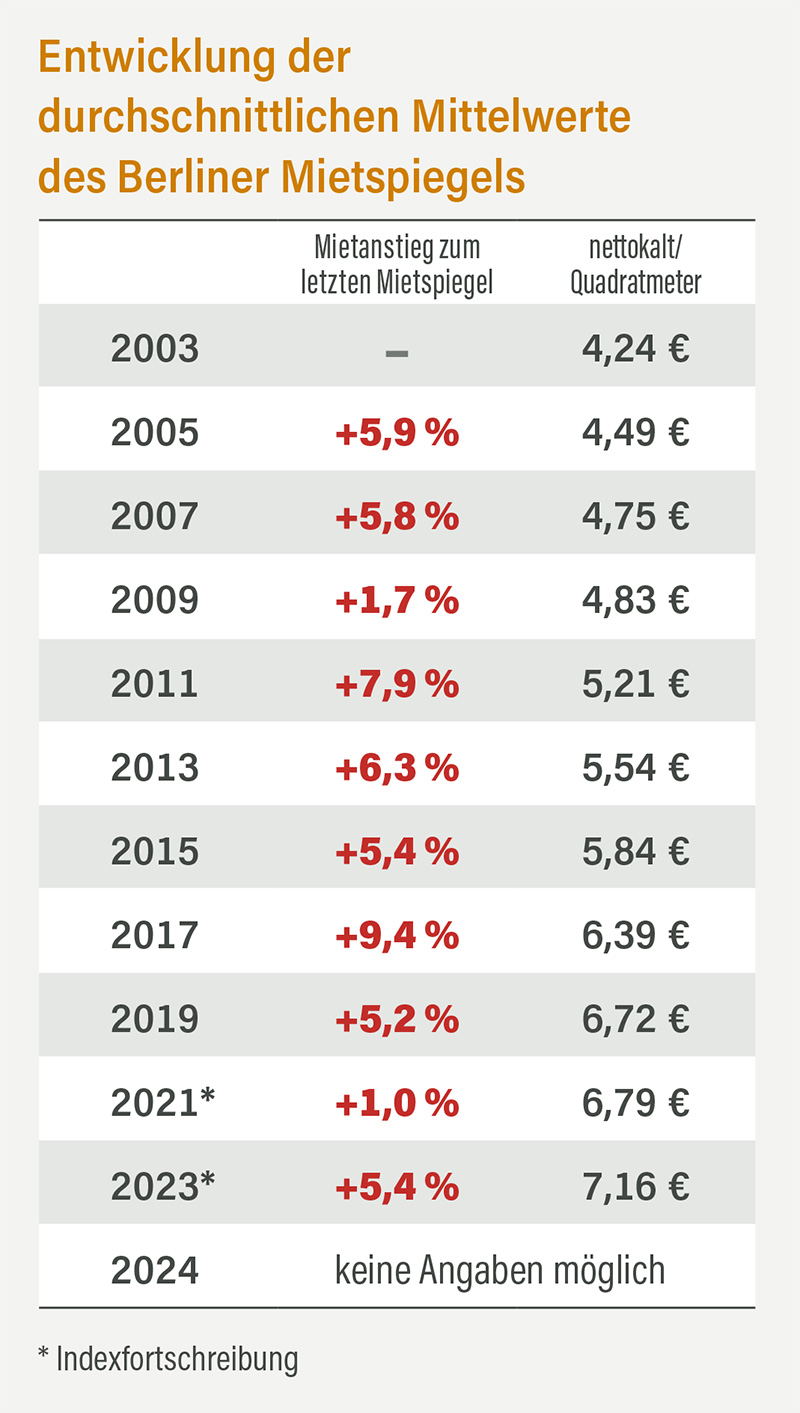Erfreulich ist, dass Berlin wieder einen qualifizierten Mietspiegel hat. Eigentlich sollte der neue Mietspiegel schon vor einem Jahr erschienen sein. Doch eine letztlich gescheiterte Klage gegen das Vergabeverfahren zur Mietspiegelerstellung hat die Arbeiten daran fast ein Jahr lang blockiert. Die Verzögerung führte dazu, dass der Senat im Juni 2023 einen Übergangsmietspiegel erlassen hat, denn der Mietspiegel 2021 wäre turnusgemäß nach zwei Jahren ausgelaufen. Der Mietspiegel 2023 war eine Indexfortschreibung, bei der alle Werte des vorherigen Mietspiegels pauschal um 5,4 Prozent erhöht wurden. Weil dies die zweite Fortschreibung ohne neu erhobene Mietdaten war, galt er nur als einfacher Mietspiegel. Als solcher ist er zwar nicht so unanfechtbar wie ein qualifizierter Mietspiegel, wird aber von den Gerichten durchaus als geeignete Schätzgrundlage für die Ermittlung der ortsüblichen Vergleichsmiete angesehen. Der neue Mietspiegel 2024 ist hingegen wieder ein qualifizierter Mietspiegel, der von allen beteiligten Mieter- und Vermieterverbänden anerkannt wurde.