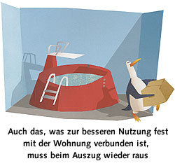 Dinge, die der Mieter zur besseren Nutzung fest mit der Wohnung verbunden hat, etwa Fußbodenbeläge, Warmwasserboiler oder extra eingepasste Wandschränke, darf er bei seinem Auszug mitnehmen. Dieses Recht verjährt sechs Monate nach Mietende (BGH, WuM 1987, 262). Oft will der Mieter diese Gegenstände aber gar nicht mitnehmen. Doch der Vermieter darf deren Entfernung verlangen (LG Berlin, Das Grundeigentum 1987, 41). Der Mieter muss dann den ursprünglichen Zustand der Wohnung auf eigene Kosten wiederherstellen. Wünscht der Vermieter, dass die Einrichtungen in der Wohnung bleiben, muss er dafür eine angemessene Entschädigung zahlen. Bauliche Veränderungen, etwa ein Wanddurchbruch, bedürfen immer der vorherigen Erlaubnis des Vermieters. Alle baulichen Veränderungen, die der Mieter ohne Erlaubnis des Vermieters vorgenommen hat, muss er beim Auszug rückgängig machen und das kann teuer werden. Im Streitfall muss der Mieter beweisen, dass er die Zustimmung des Vermieters hatte.