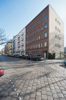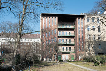 Auf der Rückseite des Hauses erstreckt sich ein etwa 500 Quadratmeter großer Garten. Die zurückversetzten außenliegenden Rettungswege, die auf der einen Seite in den Lastenaufzug, auf der anderen Seite ins Treppenhaus führten, dienen heute als Balkone. In die Wand zu den Balkonen und in die seitliche Brandwand wurden nachträglich Fenster eingebaut. Daneben sind die sakral anmutenden, typischen „Müller-Fenster“ erhalten geblieben: schmale, langgezogene Öffnungen, die sich an der Rückfront wie Orgelpfeifen die Fassade hochziehen. Zwischen den vertikalen Fensterbändern verläuft jeweils ein gleich breiter Streifen aus rotem Backstein. An der vorderen Fassade sind die Fenster in den einzelnen Etagen dagegen horizontal auf einer Ebene angeordnet. „Müller hat zwar durch Materialwahl und Fassadengliederung deutlich gemacht, dass es sich um einen Industriebau handelt, diesen aber durch die Vielzahl der Fenster und die Traufhöhe in die Blockrandbebauung integriert“, so Kahlfeldt. Doch hebt sich vor allem die Fassade von den Nachbargebäuden auch dadurch ab, dass sie von Geschoss zu Geschoss nach oben hin um einen halben Backstein zurückversetzt ist. Das Treppenhaus versprüht Industriecharme im besten Sinne. „Schon durch die geschmiedeten Geländer und Handläufe unterscheidet es sich von einem typischen Altbautreppenhaus“, sagt Stock. Ganz bewusst hat Architektin Kahlfeldt das Originalgeländer belassen und lediglich aus Sicherheitsgründen erhöht. „Uns lag viel daran, bei der Umnutzung nicht den Denkmalwert und das Erscheinungsbild zu verändern“, betont sie. „Wir wollten das Gebäude nicht totsanieren.“