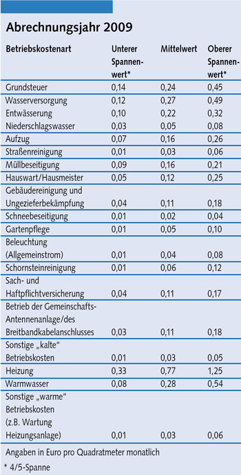 Die Höhe der Betriebskosten hängt von vielen Faktoren ab. Wo es beispielsweise keinen Aufzug oder keinen Hauswart gibt, können natürlich auch keine entsprechenden Kosten entstehen. Eine große Rolle spielt die vernünftige Bewirtschaftung durch den Vermieter, aber auch Mieter haben durch Mülltrennung und einen sparsamen Umgang mit Wasser einen Einfluss. Der Betriebskostenspiegel weist für jede Kostenart einen Durchschnittswert sowie einen oberen und unteren Wert einer Spanne auf, die vier Fünftel der erhobenen Werte berücksichtigt.