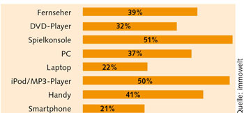Überhaupt ist der deutsche Nachwuchs bestens mit Gebrauchs- und Unterhaltungselektronik versorgt: Aus jedem zweiten Kinderzimmer sind Spielkonsole und iPod oder MP3-Player nicht mehr wegzudenken. 59 Prozent nutzen für Hausaufgaben, Computerspiele, Facebook und ähnliches den eigenen PC oder einen Laptop, für die Kommunikation unterwegs sorgt bei 41 Prozent das eigene Handy. In jedem fünften Kinderzimmer liegt außerdem ein Smartphone.