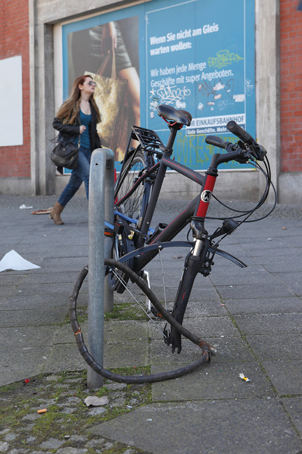 Stehen Fahrräder im Hausflur, auf dem Grundstück oder in einem allgemein zugänglichen Fahrradkeller, sollten sie unbedingt angeschlossen werden. Einige Versicherungen verlangen, dass sie sogar im eigenen Keller angeschlossen werden müssen. Nach Erfahrungen der Polizei nehmen sich Fahrraddiebe höchstens drei Minuten Zeit, um ein Fahrradschloss zu knacken. Hält ein Schloss diesem ersten „Angriff“ stand, lässt der Dieb meist von Schloss und Fahrrad ab. An guten Bügel-, Falt- und Kettenschlössern beißen sich selbst Profis mit Bolzenschneidern die Zähne aus. Bei Versuchen der Stiftung Warentest erzielte allerdings nur jedes vierte Schloss ein gutes Ergebnis. Einige Versicherer akzeptieren deshalb nur Schlösser bestimmter Hersteller. Die Stiftung Warentest untersucht in regelmäßigen Abständen die rund 300 auf dem Markt befindlichen Bügel-, Falt-, Ketten- und Panzerkabelschlösser. Ernüchternd: „Kein Fahrradschloss bietet absolute Sicherheit.“