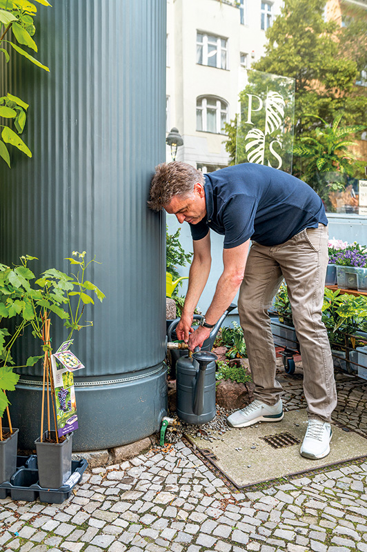 Dass dann im vorigen Jahr in Berlin die ersten beiden „öffentlichen“ Regentonnen aufgestellt werden konnten, ist der Hartnäckigkeit der Nachbarschaftsinitiative zu verdanken, aber auch einem aufgeschlossenen Bezirksamt für Ordnung, Umwelt, Straßen und Grünflächen in Charlottenburg-Wilmersdorf. Und so fließt jetzt ein guter Teil des Regenwassers nicht mehr vom Dach direkt in die Kanalisation. Das nämlich wäre eine Verschwendung, die sich Berlin längst nicht mehr leisten könne, befindet Stephan Natz, Pressesprecher der Berliner Wasserbetriebe (BWB): „Wir sind eine der niederschlagärmsten Regionen in Deutschland.“