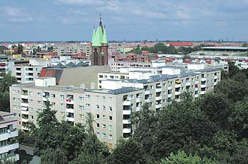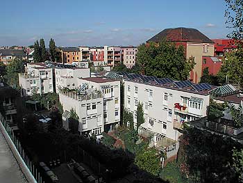 Was mit einmaligem und eher symbolischem finanziellen Anreiz sowie Information und Beratung in Berlin angekurbelt werden soll, hat sich bei einigen Projekten in der Praxis bereits bewährt. Eine Vorreiterin in Sachen solare Sanierung ist die Wohnungsbaugesellschaft DEGEWO. Als sie eines ihrer Gebäude in Wedding (Baujahr 1969) sanierte, nahm die solare Sanierung ihren Anfang: Die Heizungs- und Warmwasserversorgung wurde erneuert und auf den Stand moderner Brennwerttechnik gebracht. Damit ging ein Wechsel von Heizöl auf Erdgas einher. Hinzu kam die thermische Solaranlage auf dem zusätzlich gedämmten Dach. Für 137 Wohnungen wurden 164 Quadratmeter Flachkollektoren errichtet.