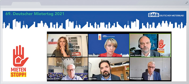 Die 400 Delegierten mussten keine Fahrkarte nach Koblenz lösen, sondern loggten sich auf ihren Rechnern ein. Wegen der Corona-Beschränkungen fand der 69. Mietertag des Deutschen Mieterbundes (DMB) am 10. und 11. Juni am heimischen Computer statt. Das Experiment gelang – und dank der Podiumsgäste aus der CDU, SPD, den Grünen und Linken wehte sogar eine frische Brise Wahlkampf durch den virtuellen Raum.