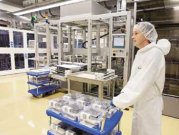 Mitarbeiter in einer Fabrik für Solaranlagen