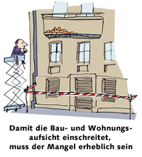 Die Wohnungsaufsicht schreitet allerdings nur bei „nicht unerheblichen“ Mängeln ein. Nach der Definition des Wohnungsaufsichtsgesetzes liegen erhebliche Mängel vor, wenn zum Beispiel Wände, Decken, Fußböden, Fenster oder Türen keinen ausreichenden Schutz gegen Witterungseinflüsse, Lärm, Wärmeverluste und Feuchtigkeit bieten, wenn die Wände und Decken nicht ordentlich verputzt oder verkleidet, tapeziert oder gestrichen sind, oder wenn Heizungen, Toiletten, Bäder und Duschen sich nicht ordnungsgemäß benutzen lassen.