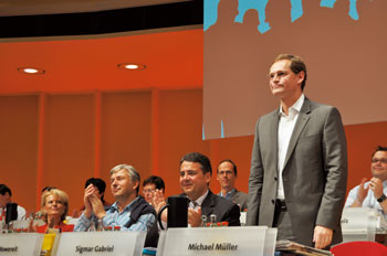 Berlins Regierender Bürgermeister Wowereit – auf dem Landesparteitag Seite an Seite mit dem SPD-Bundesvorsitzenden Gabriel – sieht wenig Chancen für Mietbegrenzungsinitiativen, am Rednerpult Landesvorsitzender Michael Müller