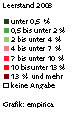 Auch diese Zahlen spiegeln also nicht den tatsächlichen Leerstand wieder. Ging der letzte Mikrozensus (April 2002) aber noch von einer bundesweiten Leerstandsquote von 8,2 Prozent aus, liegt der Leerstandsindex von empirica mit 3,9 Prozent weit darunter. Die Unterschiede zwischen alten und neuen Bundesländern sind gravierend: Der Osten verzeichnet 7,9 Prozent, der Westen 2,3 Prozent. Wohnungen mit weniger als 50 Quadratmetern Wohnfläche stehen dabei weit häufiger leer als solche mit 60 bis 80 Quadratmetern. Berlin liegt mit 5,6 Prozent weit über dem bundesweiten Durchschnitt. Der Verband Berlin-Brandenburgischer Wohnungsunternehmen (BBU) ging vor Jahresfrist noch von 2,3 Prozent Leerstand wegen „echter Vermietungsschwierigkeiten“ aus.