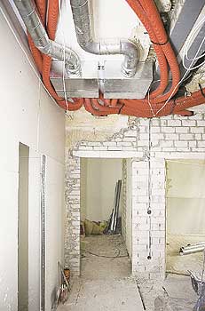 An erster Stelle steht die Reduzierung des Energiebedarfs durch einen Wärmeschutz der Gebäudehülle: Die Fassade wird gedämmt, ebenso die Kellerdecken und die Dachflächen. Die alten Fenster werden durch solche mit Isolierverglasungen ersetzt.