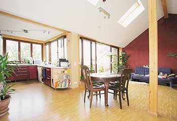 So war vor gut zwei Jahren erst einmal ein Energieberater vor Ort. Denn nur nach Vorlage eines Energiegutachtens bekommt man bei der Kreditanstalt für Wiederaufbau (KfW) ein zinsvergünstigtes Darlehen für die Sanierungsmaßnahmen. Geplant wurde ein Dachgeschossausbau für seine fünfköpfige Familie und bei dieser Gelegenheit eine Sanierung des gesamten Gebäudes auf Niedrigenergiestandard. Das beinhaltete die Anbringung von zwölf Zentimeter Dämmung an der gesamten Fassadenfläche sowie den Einbau neuer Fenster mit Wärmeschutzverglasung und neuer Heizkörper in den Wohnungen. Im Keller wurde der 93-Kilowatt-Kessel der Gaszentralheizung aus den 80er Jahren durch einen Gasbrennwertkessel mit lediglich 35 Kilowatt ersetzt. Unterstützt wird die Heizung durch 16 Solarkollektoren zu je zwei Quadratmetern – insgesamt stehen also 32 Quadratmeter der schrägen Dachfläche für sonnengewärmtes Wasser zur Verfügung. „Die Solaranlage läuft seit dem ersten Tag perfekt“, freut sich Solar-Bastler Kortenkamp, „und bringt sogar etwas höhere Erträge, als im Vorfeld errechnet wurde.“ Durch die Einspeisung des solargewärmten Wassers wird der Kubikmeter Warmwasser in der Gesamtabrechnung für alle Mieter billiger.
