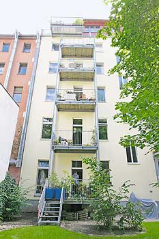 Mitten in Kreuzberg im Herzen des guten, alten SO 36 findet man unter den typischen Mietshäusern der Gründerzeit ein besonderes Objekt. Eher unscheinbar fallen hinter den hohen Linden zunächst nur die schlanken Fensterformate auf. Das beidseitig eingebaute Mietshaus strahlt in hellem Gelb. Für die Gestaltung des Sockels wurden die ortsansässigen Sprayer auf den Plan gerufen. Die dicke Dämmung sieht man der Fassade nicht an. Ebenfalls erahnt man im Vorbeigehen auch nicht die thermische Solaranlage auf dem Dach und die zwei riesigen Pufferspeicher plus modernste Brennwerttechnik im Keller.