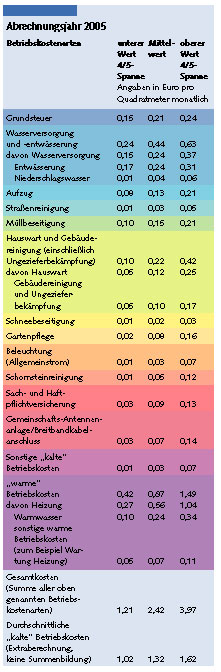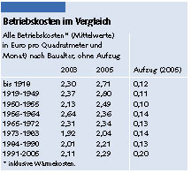 Im Vergleich zur letzten Betriebskostenübersicht vor zwei Jahren, mit der die Betriebskosten des Jahres 2003 ausgewertet wurden, zeigt sich lediglich bei den Wärmekosten (durchschnittlich 0,12 Euro pro Quadratmeter und Monat mehr) und den Kosten für Be- und Entwässerung (durchschnittlich 0,08 Euro pro Quadratmeter monatlich mehr) ein deutlicher Anstieg. Hingegen wurden für Aufzug, Hauswart und Gebäudereinigung um jeweils 0,05 Euro pro Quadratmeter im Monat niedrigere Durchschnittswerte ermittelt.