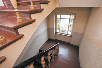 Heute lebt im vierten Stock des Hauses eine junge Familie, die erst vor einem dreiviertel Jahr eingezogen ist: „Die Wohnung besitzt ein ganz besonderes Flair und hat uns sofort gefallen: breite Fenster, drei große, helle Räume, hohe Decken, einen fast zehn Meter langen Flur und rund 110 Quadratmeter Fläche“, freut sich der junge Mann. Aus dem Küchenfenster blickt man in den kleinen Hinterhof. An einer Zimmerwand kann man beim näheren Hinschauen noch den Durchbruch zur Nachbarwohnung erkennen.