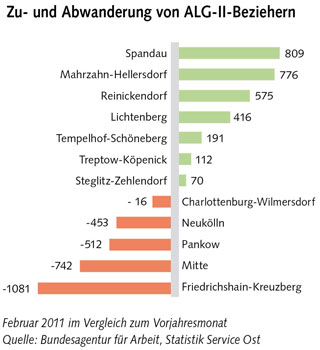 Vor allem in den begehrten Innenstadtbezirken, allen voran Friedrichshain-Kreuzberg, aber auch Mitte und Pankow, ist eine Abwanderung von Arbeitslosen zu beobachten. Spandau und Marzahn-Hellersdorf dagegen verzeichnen Zuwächse bei Beziehern von Arbeitslosengeld II (ALG II). In den Großsiedlungen in West-Staaken oder Falkenhagener Feld gibt es noch freie – und bezahlbare – Wohnungen.