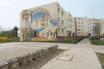 Bewusst neue Akzente wollte das Wohnungsunternehmen Degewo setzen, als man 2009 das 13 mal 10 Meter große Wandgemälde „Tanzen in Marzahn“ an der Giebelfront der Mehrower Allee 46 von dem Künstler Frank Beutel gestalten ließ. „Ziel war es zu zeigen, dass der Stadtumbau Ost keine Abkehr von der Tradition der Großsiedlung darstellt, sondern ihre Weiterentwicklung ist“, erklärt Lutz Ackermann, Pressesprecher der Wohnungsbaugesellschaft.