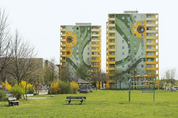 „Hier musste etwas ganz Besonderes hin – ein Hingucker“, sagt Andrej Eckhardt, der Vorsitzender der Wohnungsgenossenschaft „Grüne Mitte“ in Hellersdorf. Er meint die beiden Elfgeschosser an der Zossener Straße, von deren Fassaden seit 2009 riesige Sonnenblumen sommergelb und wiesengrün leuchten. Sie sollen, so Andrej Eckhardt, den „Eingang zum aufblühenden Wohngebiet Hellersdorf veranschaulichen“.