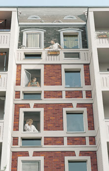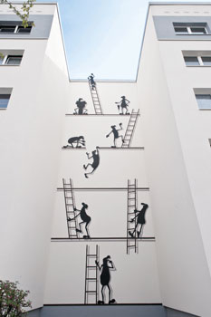 Die „Glücksmänneken“ erklettern die Fassade eines Wohnhauses der Hellersdorfer Genossenschaft „Grüne Mitte“