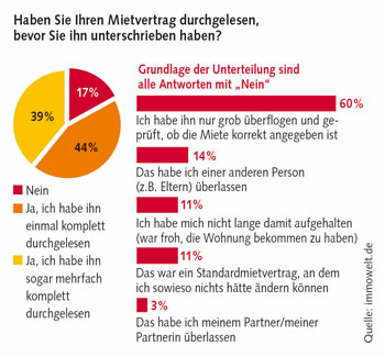 17 Prozent der deutschen Mieter haben ihren Mietvertrag vor der Unterzeichnung nicht vollständig gelesen, aber: immerhin 60 Prozent prüfen zumindest, ob der angegebene Mietpreis stimmt. Besserverdienende Mieter sind die kritischeren Vertragspartner.