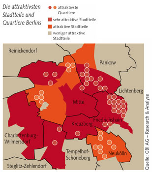 Dass junge Menschen in Berlin vor allem in den Szene-Bezirken Friedrichshain-Kreuzberg und Mitte-Tiergarten wohnen wollen, wenn sie es sich leisten können, ist nicht neu. Die Studie belegt, dass in Kreuzberg (Scoring-Wert 97) besonders die Quartiere Bergmannstraße/Chamissoplatz und Görlitzer Park gefragt sind. In Friedrichshain (92 Punkte) sind es unter anderem der Bersarinplatz, der Boxhagener Platz und die Gegend um das Frankfurter Tor, in Mitte (95 Punkte) der Kiez um den Volkspark Am Weinberg. Aber auch Schöneberg liegt mit 87 von 100 möglichen Punkten mit der Bülowstraße und dem Kiez um den Gasometer noch gut im Rennen. Überraschend, dass auch Wedding mit Brunnen- und Leopoldplatz und den Kiezen um die U-Bahnhöfe Osloer Straße, Pankstraße und Seestraße noch relativ gut abschneidet.
