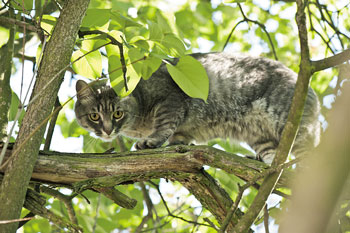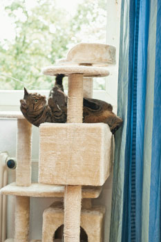 „Und anders als beispielsweise Hunde bewegen sich Katzen dreidimensional“, fügt die Tierärztin hinzu. „Sie gehen über Bänke, Tische, springen auf Schränke – Katzen erreichen erstaunliche Höhen.“ Wen das stört, der muss Alternativen bieten: Kletterbäume mit verschiedenen Sitzplätzen, Verstecke, Kratzmöglichkeiten. Und das nicht nur an einer Stelle – gerade bei mehreren Katzen in einer Wohnung entstehen leicht Rivalitäten. Eine jede muss ihr eigenes Futter, ihren Schlafplatz und ihre Toilette haben. „Am besten, ein Katzenklo mehr als Katzen im Haus sind“, lautet der Rat der Tierärztin. Gleichzeitig warnt sie vor den Gefahren, die den Tieren drohen: Stürze aus großen Höhen lassen sich nur durch Netze vor Fenstern und Balkonen verhindern. Kippfenster müssen unbedingt mit einer speziellen Sicherung versehen werden. „Wenn eine Katze versucht, sich durch den Spalt zu zwängen, wird der zur Todesfalle für das Tier.“ Gefahren für die Tiere gehen aber auch von offenem Feuer, heißen Herdplatten, von geöffneten Waschmaschinen, geschmückten Weihnachtsbäumen und giftigen Zimmerpflanzen aus. Was sie draußen nie fressen würden – drinnen probieren sie es doch: am Korallenbäumchen knabbern, Lametta schlucken.