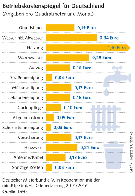 Der leichte Rückgang ist vor allem auf einen milden Winter und günstige Preise für Heizöl zurückzuführen, heißt es beim DMB. So sanken die Preise für Heizöl im Vergleich zum Vorjahr um knapp 8 Prozent. Fernwärme wurde um 1,3 Prozent preiswerter, der Gaspreis blieb fast unverändert. Rund 64 Prozent der Betriebskosten entfallen auf Heizung und Warmwasser. Die aktuelle – nicht rechtsverbindliche – Übersicht weist für Heizkosten einen durchschnittlichen Betrag von 1,10 Euro auf, Warmwasser schlägt mit 0,29 Euro zu Buche. Somit sind insgesamt 12 Cent pro Quadratmeter weniger zu zahlen als nach dem letzten Betriebskostenspiegel. Allerdings gibt es große regionale Unterschiede. Der Grund: Die Gebühren für Wasser, Müllabfuhr, Grundsteuer und so weiter legen die Kommunen fest.